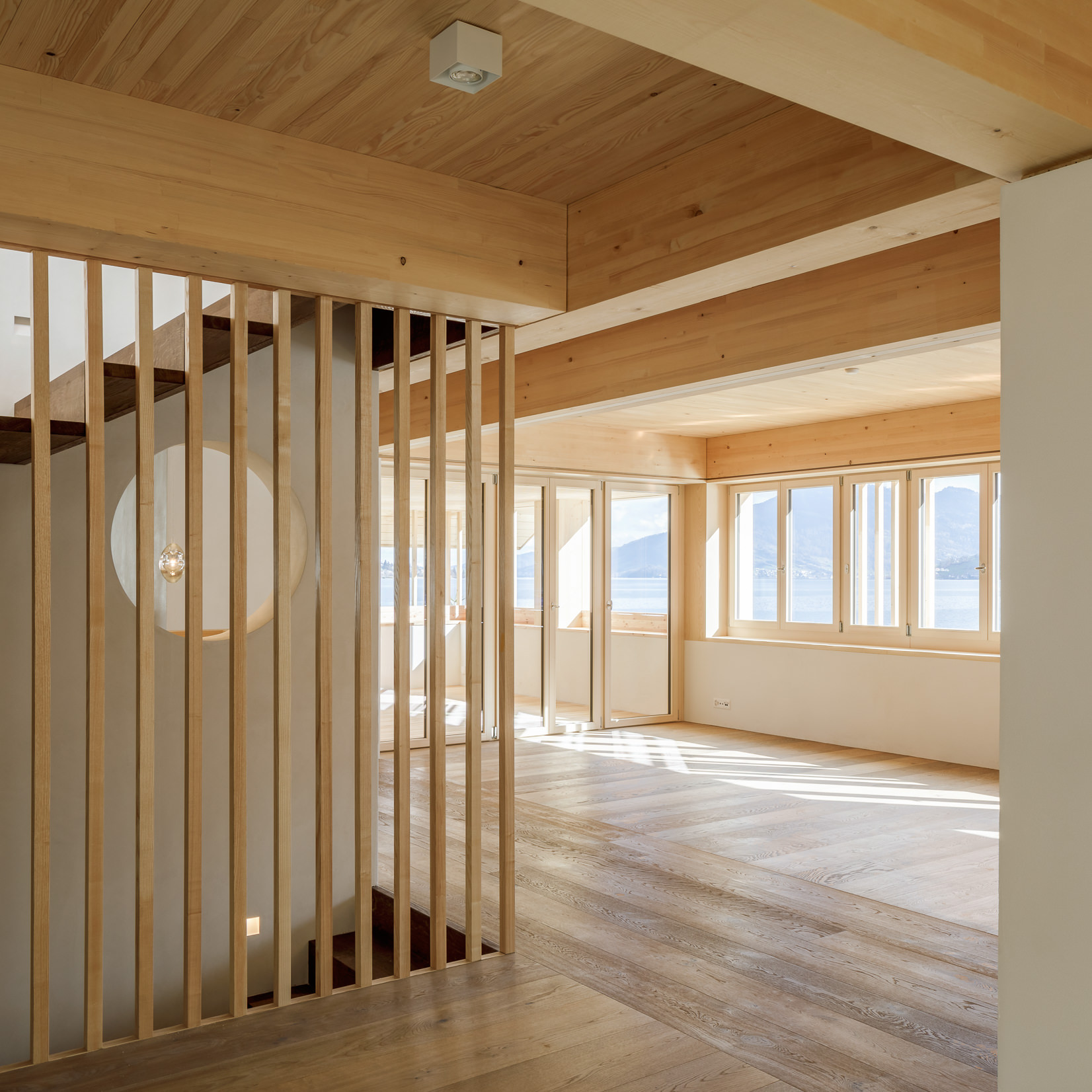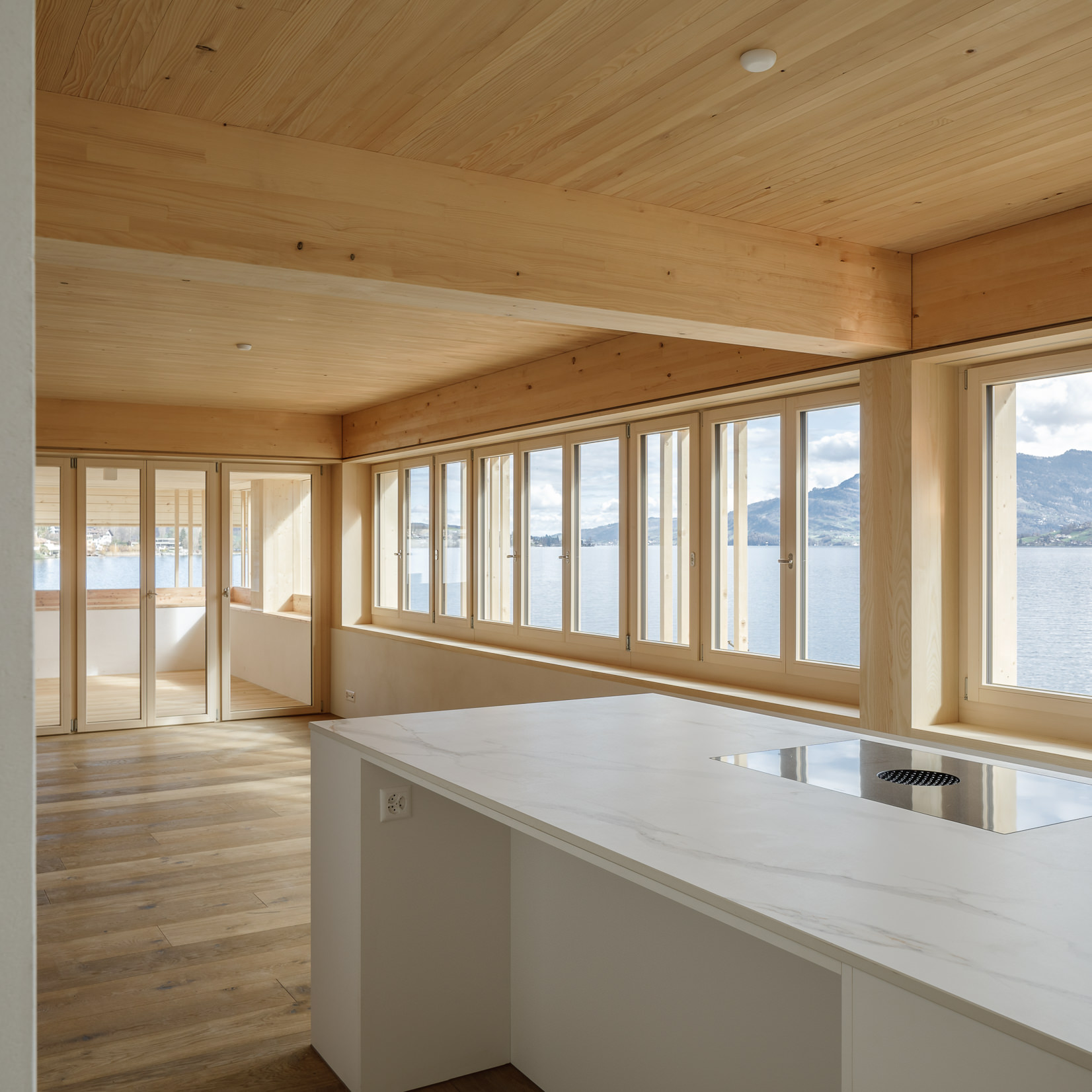 und einem diskreten Dachgarten, wird der Bezug von innen zum präsenten See und